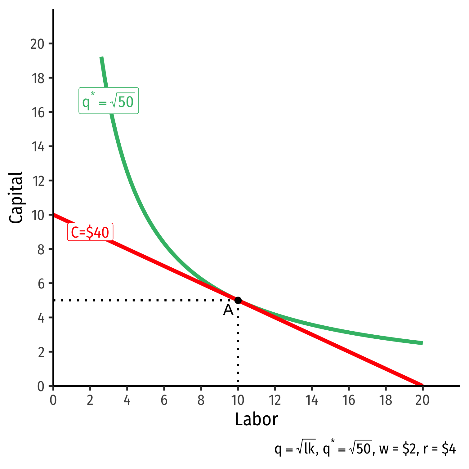 Graphical solution: Lowest isocost line tangent to desired isoquant (A)