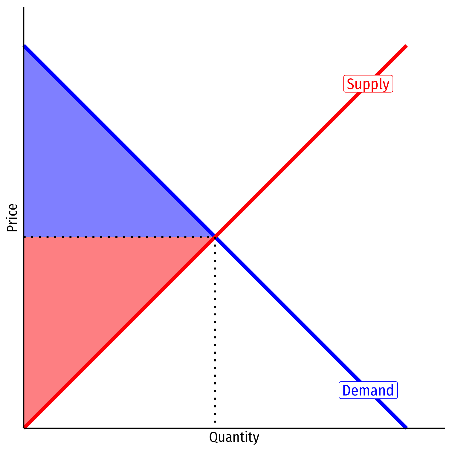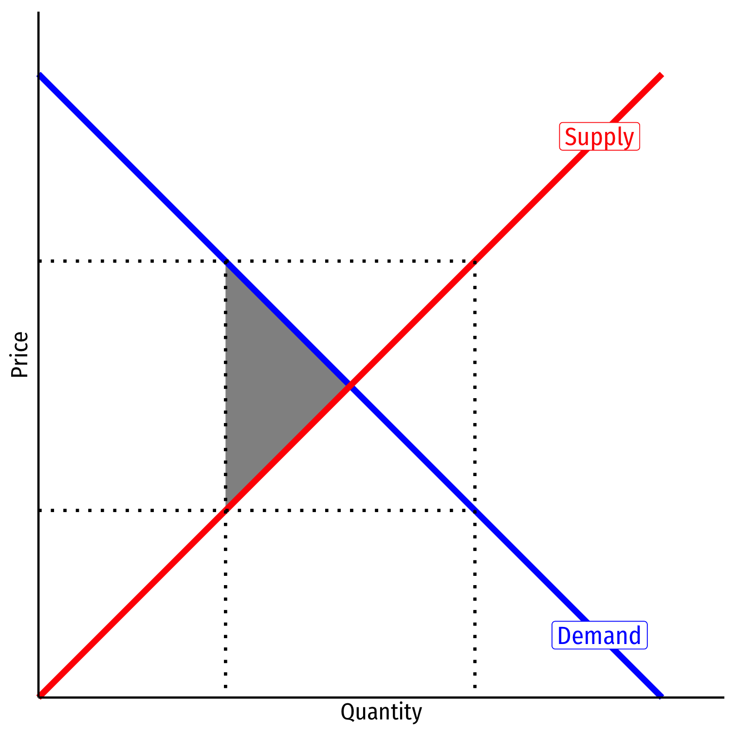 There are unrealized gains from trade that exist in disequilibrium (shaded)