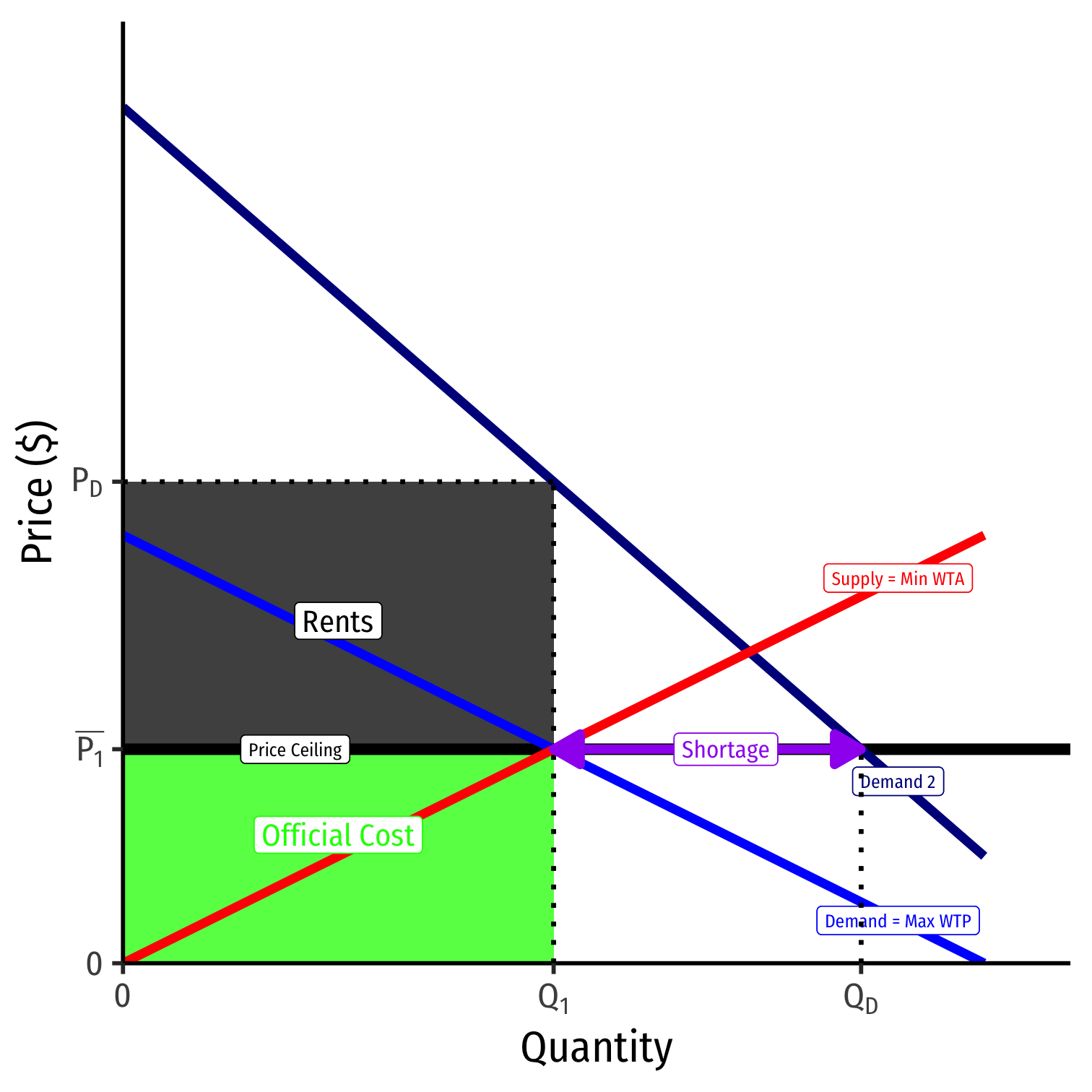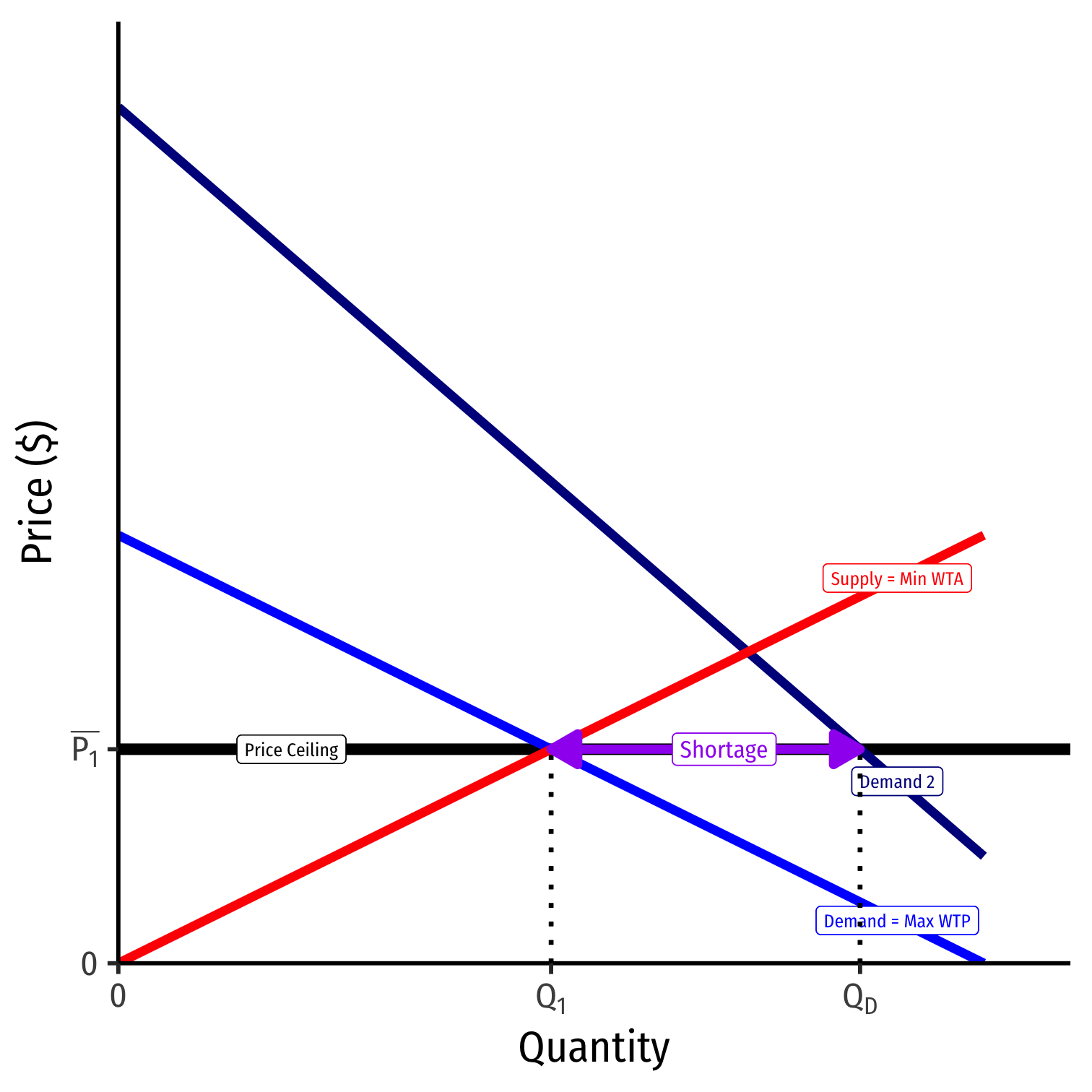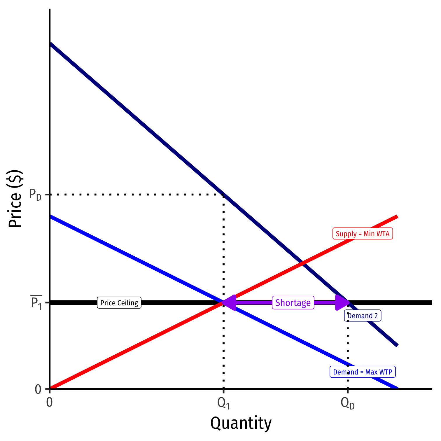 If prices were allowed to adjust: buyers would bid higher prices to get the scarce Qs goods